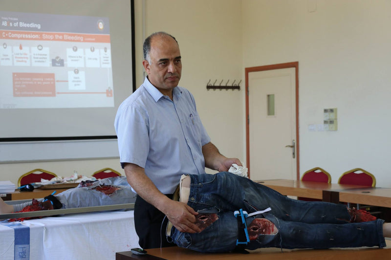 Dr. Mohammed Al Attar teaches a Stop The Bleed class using Glia Gaza 3D-printed tourniquets- Gaza, 2018