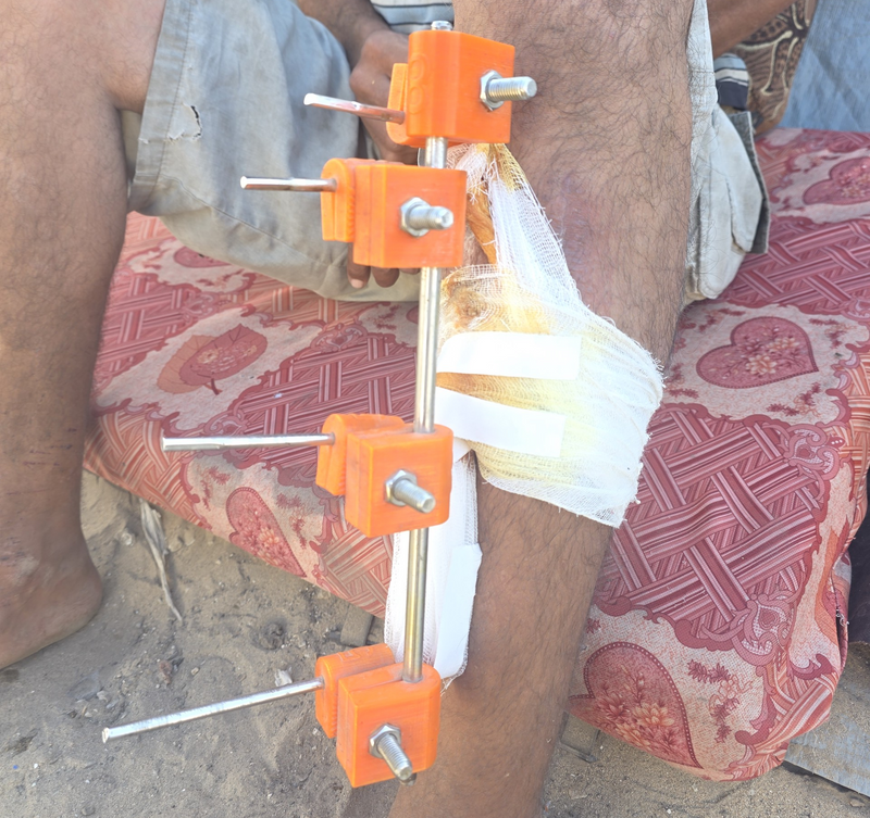 Glia Gaza-manufactured surgical external fixator on a Palestinian patient, who is responding well to treatment- 2025